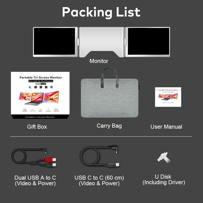 Monitorul dublu portabil S688 de 14 inch cu panou IPS și rezoluție 1920x1200 oferă imagini clare și culori vibrante 100% sRGB. Perfect ca ecran secundar pentru productivitate mobilă, este compatibil cu Windows și Mac și se conectează simplu prin USB-C, fără nevoia altor cabluri.